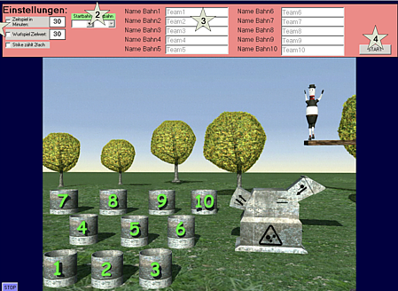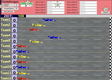 Hier spielen mehrere Bahnen direkt gegeneinander auf einer separaten Anzeige. Beamer oder Großbild TV: Es werden die Ergebnisse dann grafisch dargestellt. Der Counter PC übernimmt dann die Auswertung der Strike und Spare Wertung. Jeder Strike und Spare bedeutet Punkte für die entsprechende Bahn. Die Punkte werden mit 3D Animationen dargestellt und jeder Mannschaft gutschrieben. Es gibt 2 Spiele Autorennen und Pin Shredder.