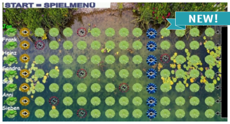 Unser Froschspiel begeistert alle Kinder und Erwachsene. Jeder Spieler erhält einen Frosch und steuert diesen durch ein gefährliches Gewässer. Es gibt viele Fallen und Bonuspunkte. Gespielt wird nach Art "Mensch Ärger Dich nicht". Man kann sich schnell nach vorn arbeiten, aber auch an den Anfang zurückfallen. Ideal für den Kindergeburtstag. Ein unterhaltsames Spiel für Jung und Alt, das Geschicklichkeit und Strategie vereint.